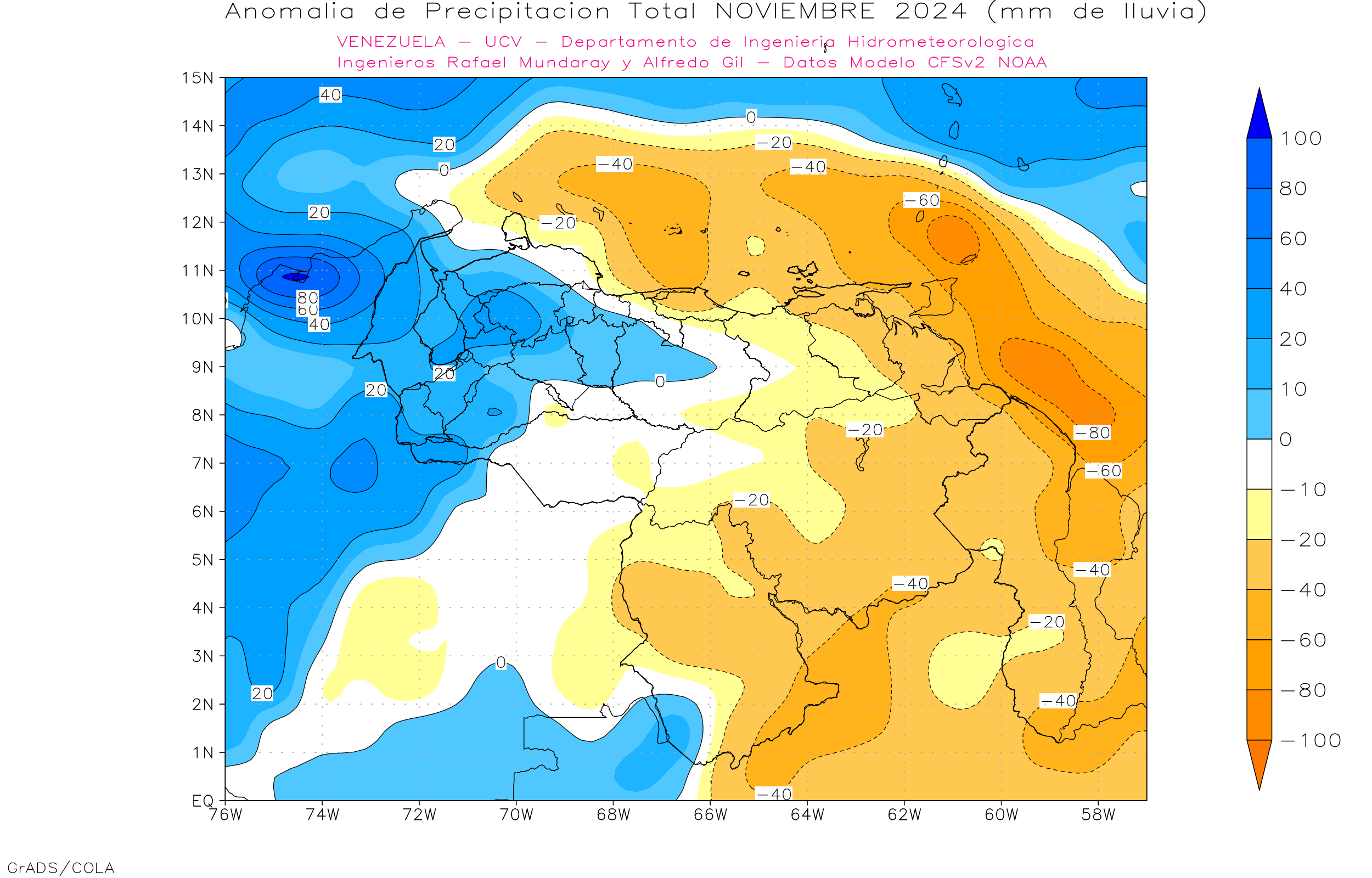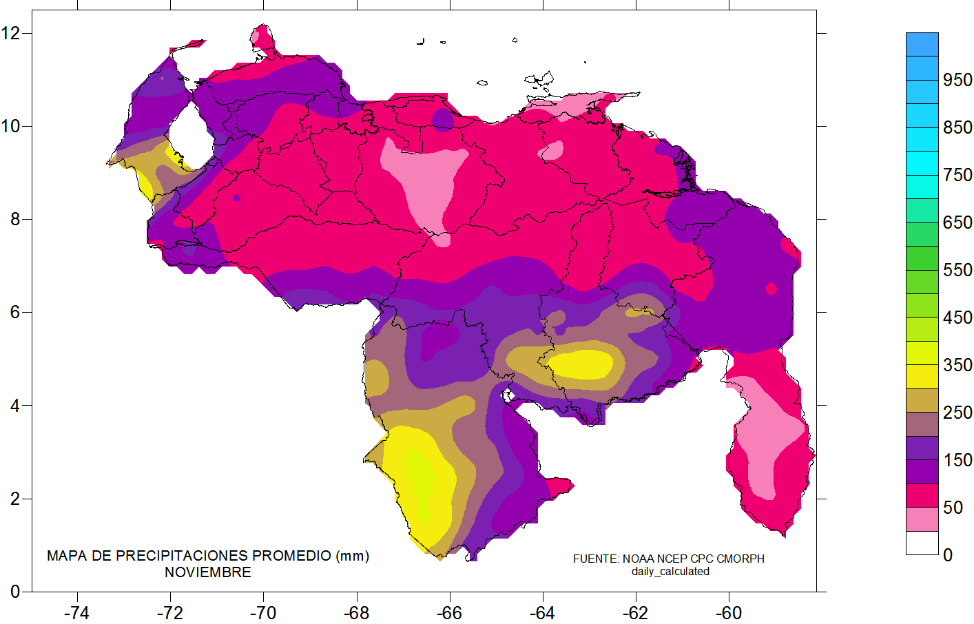 De acuerdo a la estadística de la precipitación estimada ( NOAA NCEP CPC CMORPH, daily_calculated) durante el trimestre Sep-Oct-Nov, los principales eventos de precipitaciones se ven en Amazonas, sur Bolívar y sur0oeste de Zulia con centros de precipitaciones cercanos 1100 mm, por encima del 7° nortes precipitaciones por debajo de los 400 mm, por debajo de los 7° N la precipitación entre 500 y 1100 mm. A lo largo de costa las precipitaciones por debajo de los 200 mm