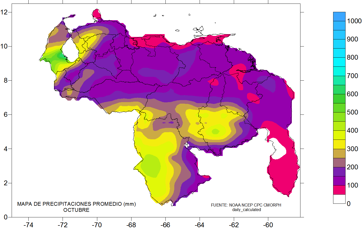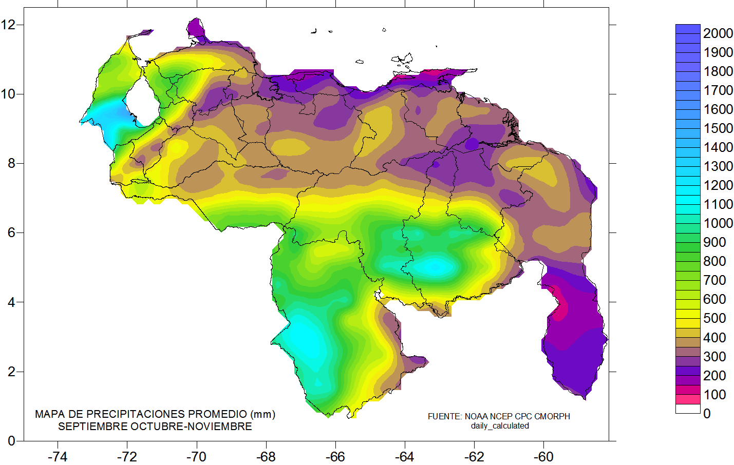 En los mapas de la estadística de la precipitación estimada ( NOAA NCEP CPC CMORPH, daily_calculated) durante los meses septiembre, noviembre y diciembre, en septiembre las máximas precipitaciones se ubican en Amazonas, suroeste Bolívar, sur del lago de Maracaibo y sur de Apure, octubre y noviembre se reducen las áreas de máximas precipitaciones al sur de Amazonas con totales por debajo de los 300 mm. Al norte del Orinoco se aprecia precipitaciones por debajo de los 150 mm. Se aprecia el retiro de la temporada de lluvia en casi todo el territorio nacional.
