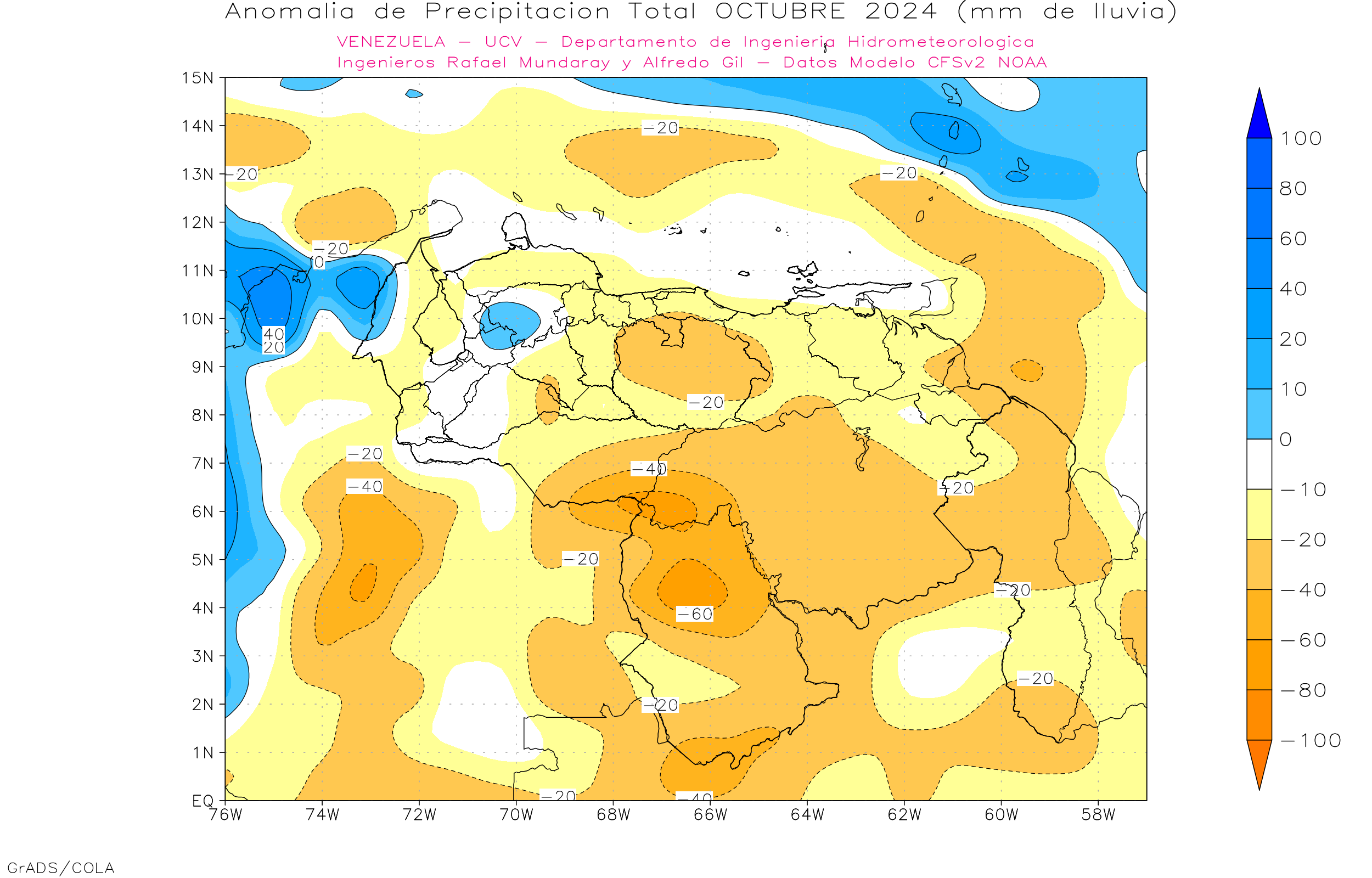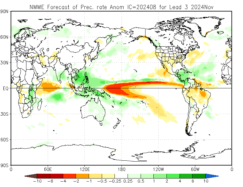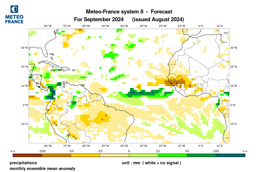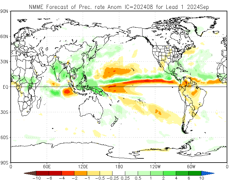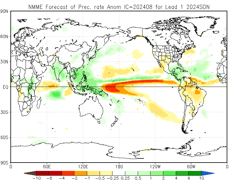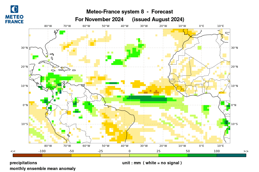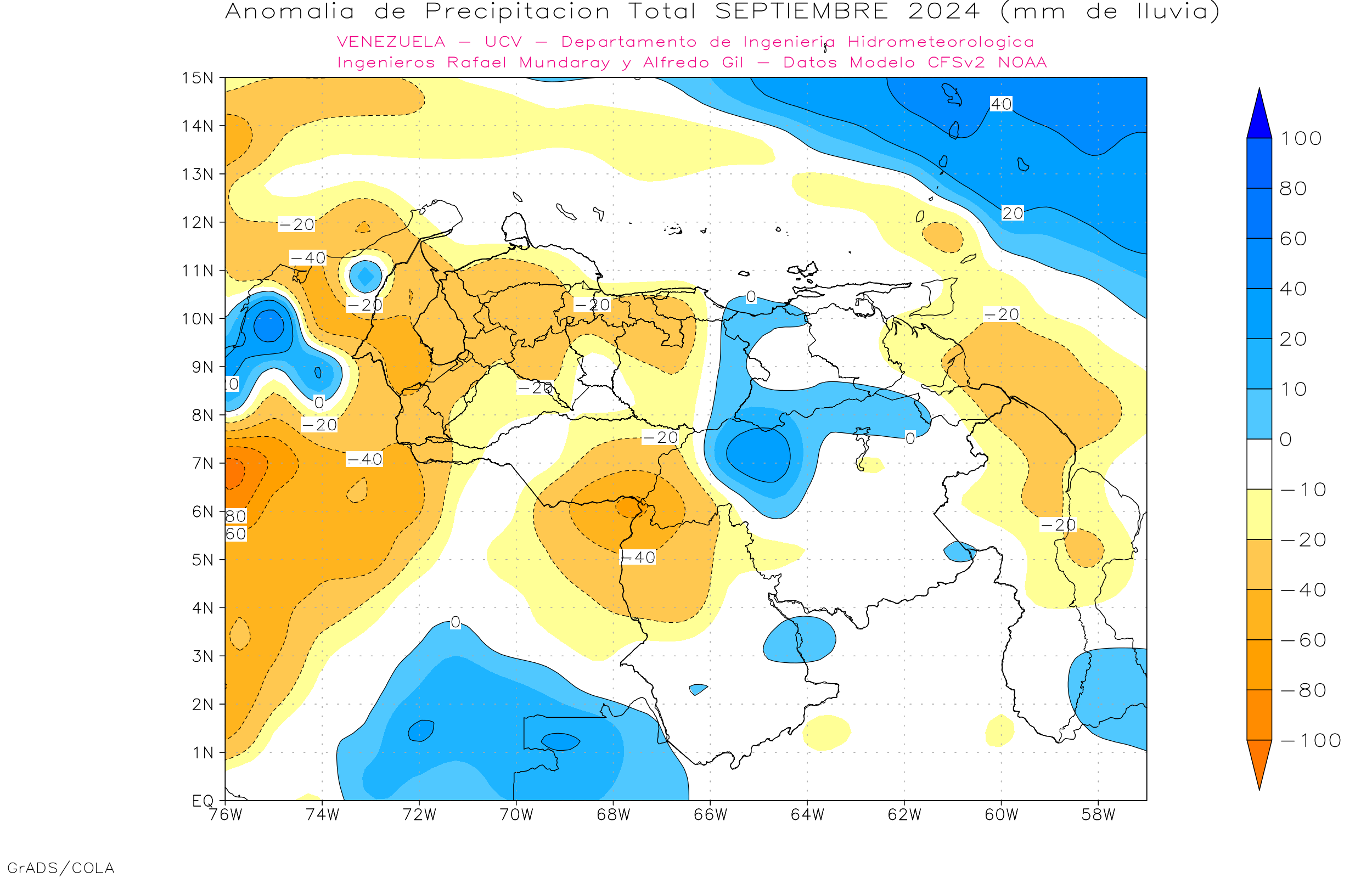 The North American Multi-Model Ensemble (NMME), Deutscher Wetterdienst de Alemania, Meteo France de Francia, ECMWF europeo, Met Office de Inglanterra, IRI, Australia Bureau of Meteorology, emperical, Integrated del CPTEC Brasil y CFSv2 de Estados Unidos. Se observa que el comportamiento de la precipitación para el trimestre Sep-Nov/2024 el 50% de los modelos ubican gran parte del país por encima de la media, lo que representa una reducción con respecto al mes pasado. Se observa una tendencia hacia la reducción de los eventos de precipitación a nivel nacional el sur del país se observa una tendencia a la reducción de los eventos de precipitación (anomalías negativas), las mas importante en el sur del país, llanos venezolanos y colombianos. Esta reducción de los eventos de precipitaciones no descarta la ocurrencia de eventos de alta intensidad en el territorio nacional.