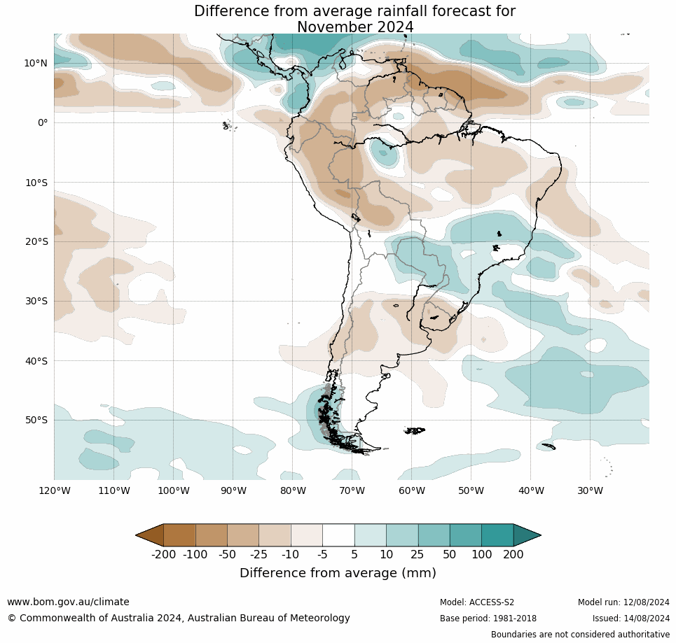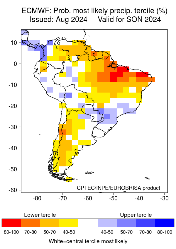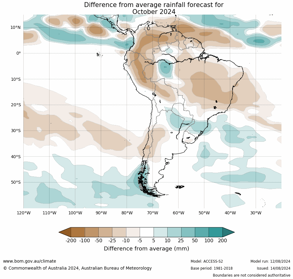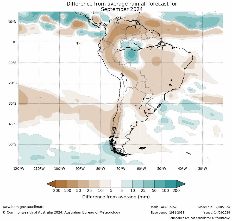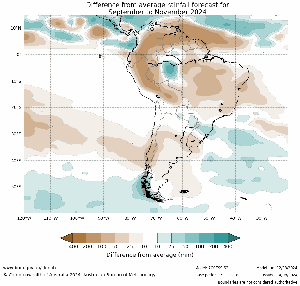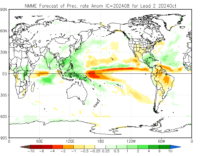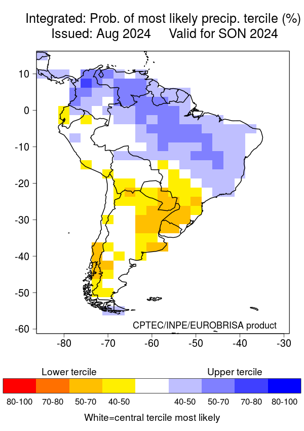 The North American Multi-Model Ensemble (NMME), Deutscher Wetterdienst de Alemania, Meteo France de Francia, ECMWF europeo, Met Office de Inglanterra, IRI, Australia Bureau of Meteorology, emperical, Integrated del CPTEC Brasil y CFSv2 de Estados Unidos. Se observa que el comportamiento de la precipitación para el trimestre Sep-Nov/2024 el 50% de los modelos ubican gran parte del país por encima de la media, lo que representa una reducción con respecto al mes pasado. Se observa una tendencia hacia la reducción de los eventos de precipitación a nivel nacional el sur del país se observa una tendencia a la reducción de los eventos de precipitación (anomalías negativas), las mas importante en el sur del país, llanos venezolanos y colombianos. Esta reducción de los eventos de precipitaciones no descarta la ocurrencia de eventos de alta intensidad en el territorio nacional.