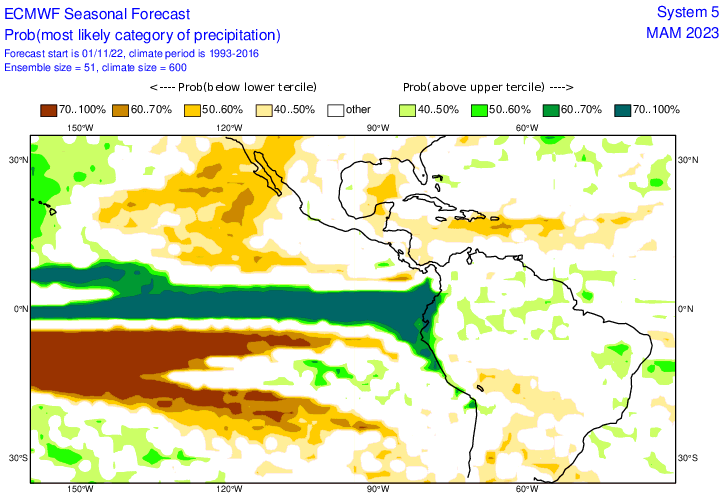 5 (50.0 %) modelo dan anomalías negativas, 2 (20.0 %) de los modelos precipitaciones promedio y 3 (30.0 %) de los modelos dan anomalías positivas.