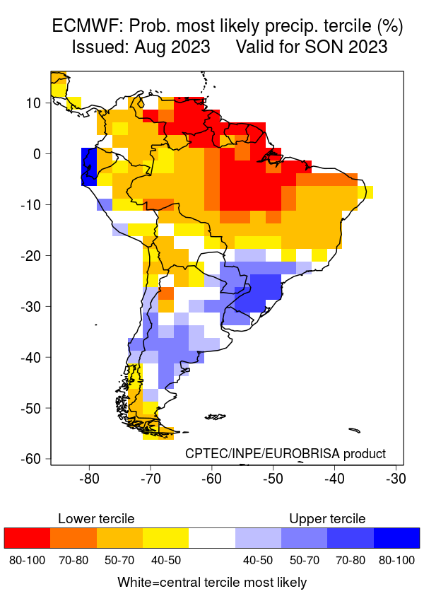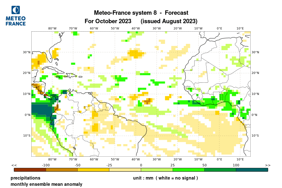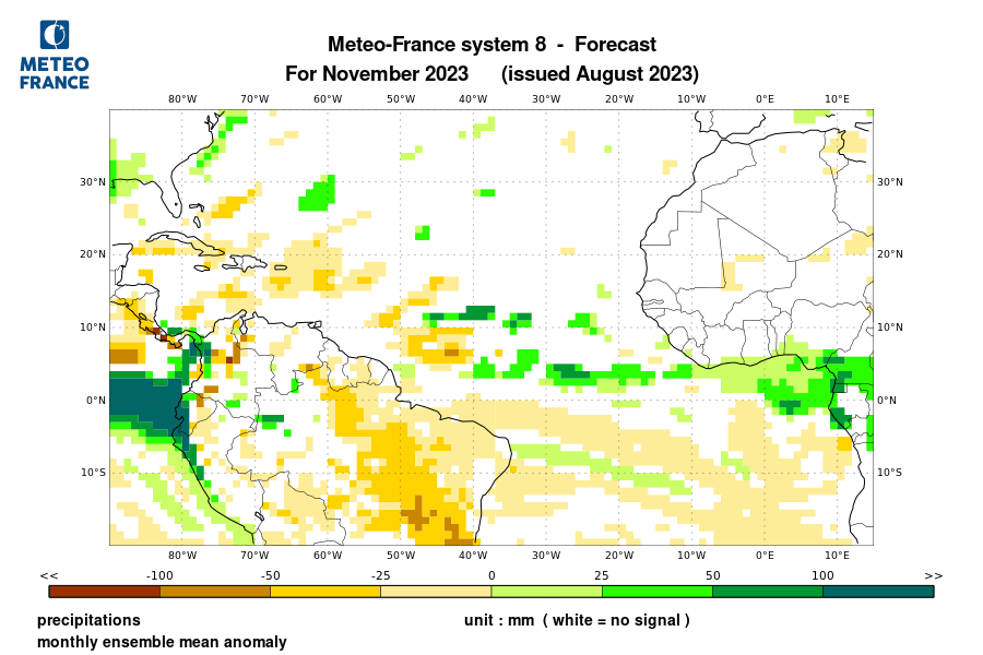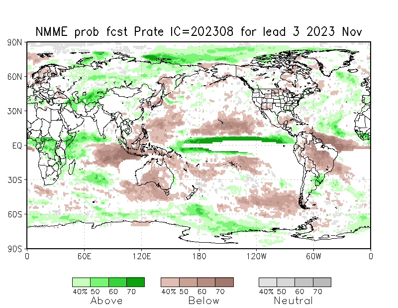 The North American Multi-Model Ensemble (NMME), Deutscher Wetterdienst de Alemania, Meteo France de Francia, ECMWF europeo, Met Office de Inglanterra, IRI y CFSv2 de Estados Unidos. Se observa que el comportamiento de la precipitación para el trimestre SEP-Oct-NOV/2023: